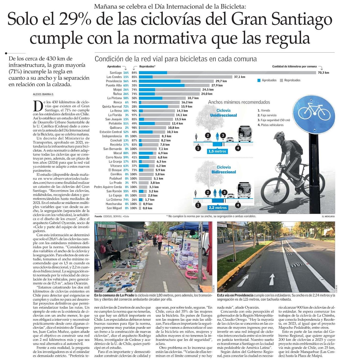 De los casi 430 km de ciclovías en el Gran Santiago, solo 29% cumple con la normativa que las regula. Así lo establece un estudio del Cedeus que se presentó en la antesala del Día Internacional de la Bicicleta, conmemorado el 3 de junio. El análisis tuvo como finalidad realizar un catastro de las ciclovías del Gran Santiago y determinó que el 71% de los kilómetros de ciclovías no cumplen con los estándares mínimos definidos por la norma, que toma como ancho mínimo recomendado 1,5 m cuando es ciclovía recreacional y 2,2 m cuando es bidireccional.