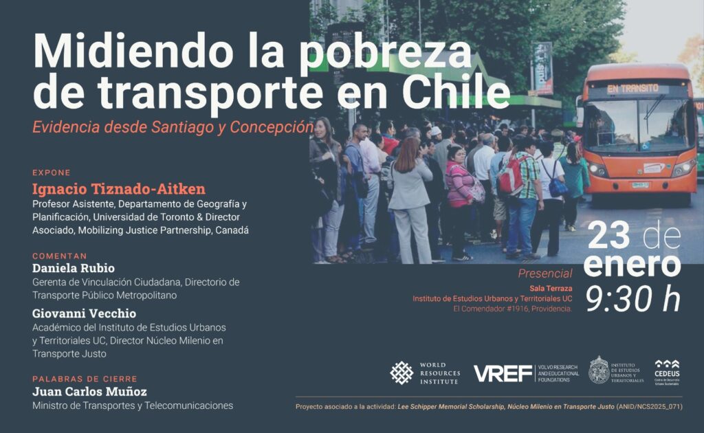CEDEUS co-organiza el evento “Midiendo la pobreza de transporte en Chile: Evidencia desde Santiago y Concepción”, instancia en la que se presentará un nuevo proyecto de investigación que busca aportar evidencia para una agenda de movilidad más equitativa y sustentable en el país. La actividad se realizará en Concepción (22 de enero) y Santiago (23 de enero), y contará con la participación de investigadores del Centro.